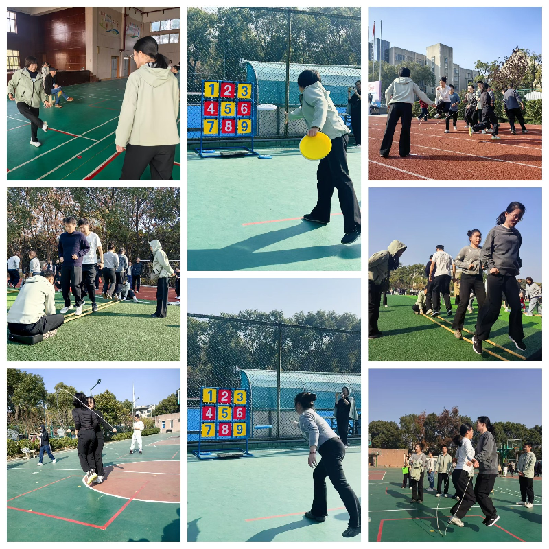 比赛当天气候适宜,气氛热烈。在“双人一心,绳采飞扬”环节,两对搭档配合默契,绳子划出流畅弧线,计数声伴随着均匀的落地节奏;“羽翔云天,稳步如飞”踢毽项目中,老师们脚步灵活,毽子在空中划出轻巧的轨迹,一来一往间尽显传统运动的趣味与活力;在“默契穿梭,同心联动”跳长绳项目中,我校十名教师配合默契,摇绳稳当,队员依次流畅穿过,即使偶有失误也迅速调整;飞盘掷准赛场,老师们凝神静气,手腕发力,飞盘划过弧线稳稳落入高分格,引来一片叫好。尤其在“同心击节,齐足并跃”跳竹竿环节,四名老师跟随竹竿敲击的节奏同步跳跃,展现了良好的协调性与团队默契。